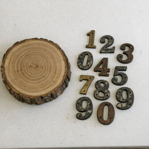 Attach the vintage metal numbers using strong adhesive or by screwing them into the wood slice. Make sure they are securely fixed.