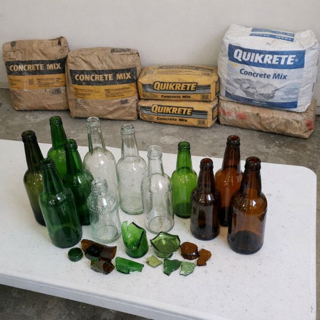 While the concrete is still moist, press the recycled glass bottles into the edge of the concrete, arranging them closely together and ensuring they are securely embedded.