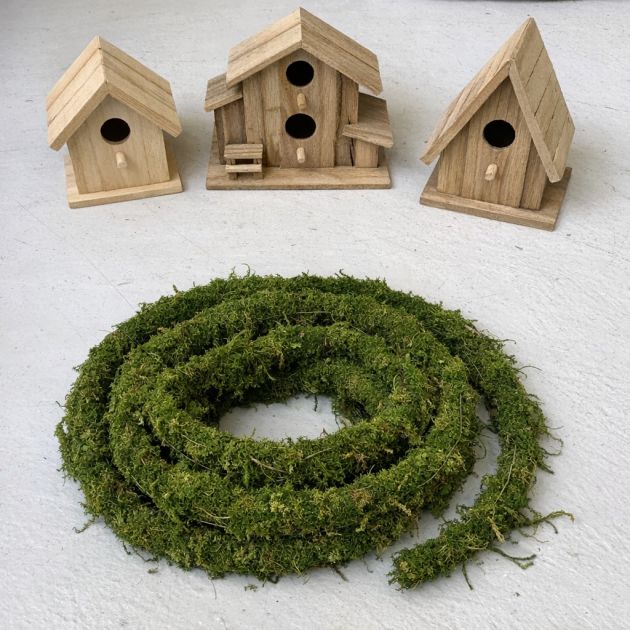 Wrap the moss garland around the stacked birdhouses, covering them generously. Use the hot glue gun to secure the moss in place, ensuring no bare wood is visible.