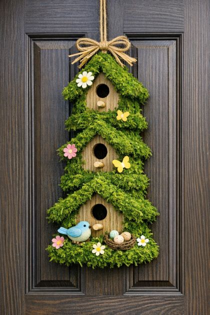 Transform your front door into a springtime haven with this charming DIY project. Perfect for those looking to add a touch of nature and whimsy to their entryway, this birdhouse decor is sure to captivate visitors and neighbors alike. By stacking wooden birdhouses and adorning them with moss garland, you'll create a unique and inviting aesthetic that celebrates the beauty of the season.