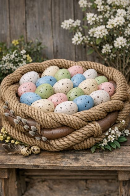 This giant spring nest can be styled as a centerpiece on your porch, surrounded by potted plants and greenery to enhance its natural look. Consider placing it on a rustic wooden table or a vintage crate for added height and dimension. The neutral tones of the brown pool noodles and jute rope allow it to blend seamlessly into various decor styles, from farmhouse to bohemian. Add fairy lights around the nest for a magical glow in the evenings.