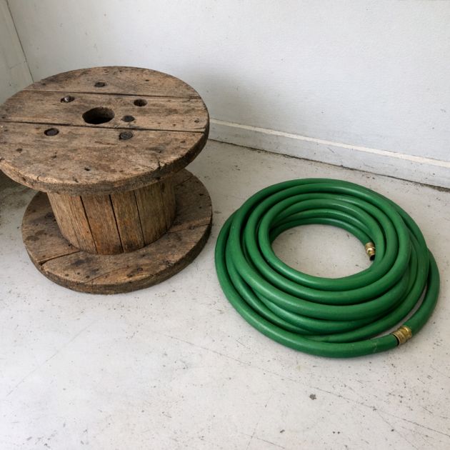 5. Start wrapping the green rubber hose around the spool, beginning at the bottom and working your way up. Ensure the hose is evenly distributed and not too tightly wrapped to prevent kinks.