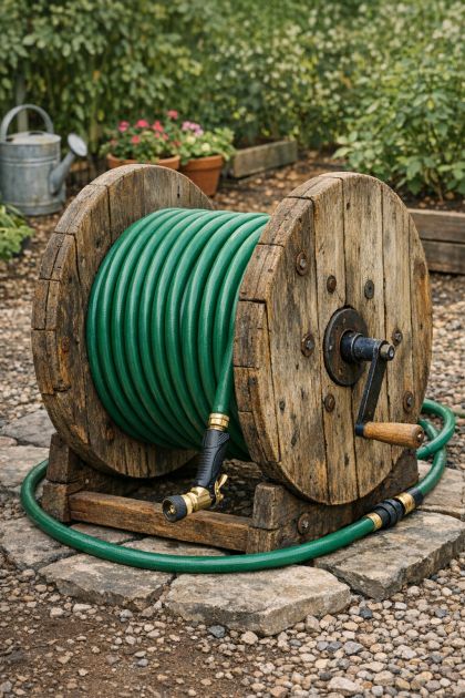 This DIY garden hose reel seamlessly integrates into outdoor spaces characterized by rustic, farmhouse, or eclectic styles. The combination of natural wood and vibrant green rubber provides a contrast that is both eye-catching and harmonious with natural elements. Place this reel near a garden bed, patio, or any outdoor water source for easy access and to enhance the area's visual appeal. Its rustic wooden finish pairs well with other natural materials like stone pathways or wooden outdoor furniture.