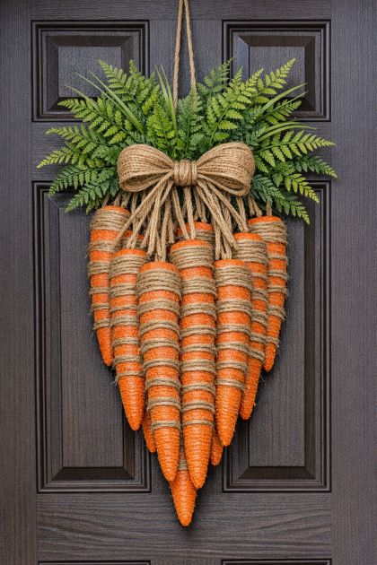 This DIY spring carrot door swag can be styled as a welcoming feature on your front door, lending a cheerful and fresh vibe to your entrance. Complement it with a rustic wreath or a wooden 'Welcome' sign to enhance the seasonal theme. Opt for natural elements and pastel colors in your entryway decor to create an inviting and cohesive spring aesthetic.