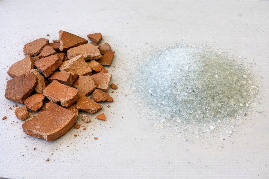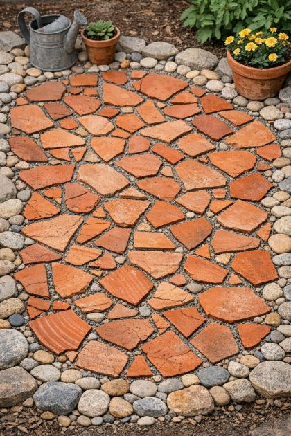 5. Carefully press the arranged terracotta pieces into the wet concrete, leaving small gaps between each piece to mimic the look of flagstone.