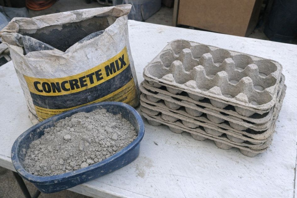 Gently shake or tap the egg cartons to remove air bubbles and level the concrete surface.