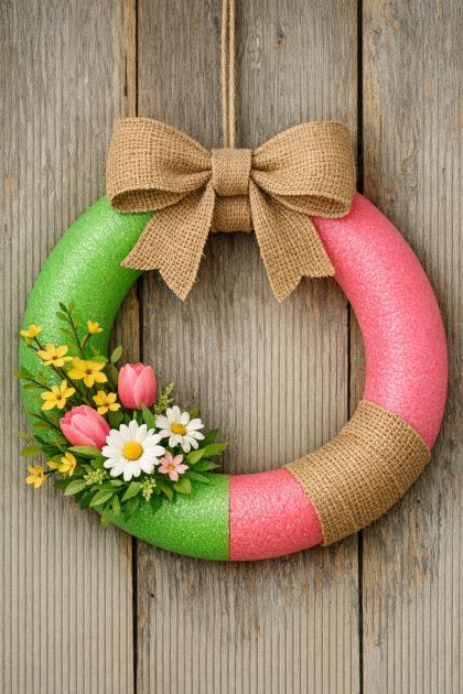 This pool noodle wreath, wrapped in burlap, lends itself well to farmhouse and rustic interior styles. Hang it on your front door for a welcoming touch or place it above a mantel to complement natural wood tones and greenery. Pair it with other rustic elements like wicker baskets, vintage lanterns, or mason jar vases to create a cohesive look.