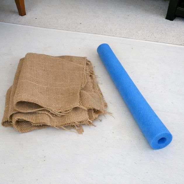 Cut strips of burlap, each about 4 inches wide, and begin wrapping the pool noodle base. Overlap the burlap slightly as you go to ensure full coverage.
