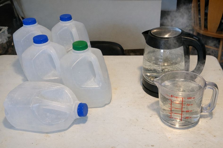 Submerge the cut edge of each milk jug into the steaming water for about 30 seconds to soften the plastic, which will help eliminate sharp edges and make the jugs easier to handle.