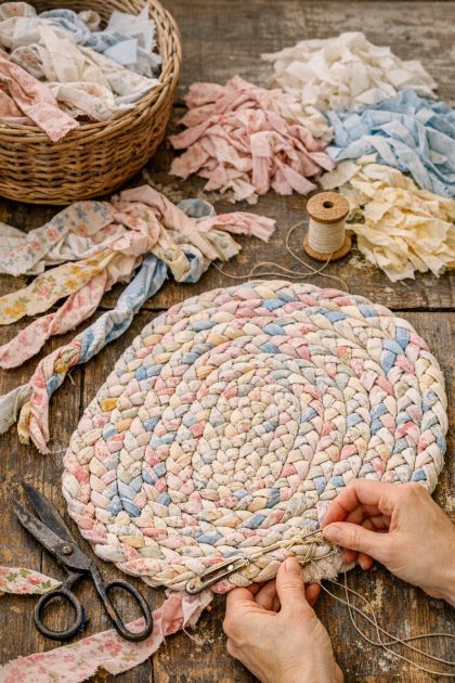 6. Coil the braided structure into a circular or oval shape, depending on your preference, and stitch it together using a sturdy needle and thread at regular intervals to maintain its shape.