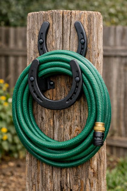 This DIY hose holder seamlessly fits into a rustic or farmhouse-style backyard, complementing natural wood tones and metallic accents. It pairs well with wooden fences, stone pathways, and lush garden settings. The weathered cedar post adds an aged, vintage appeal, while the black iron horseshoes introduce an industrial touch. This piece serves both as a functional item and a decorative sculpture, enhancing the visual appeal of any outdoor space.