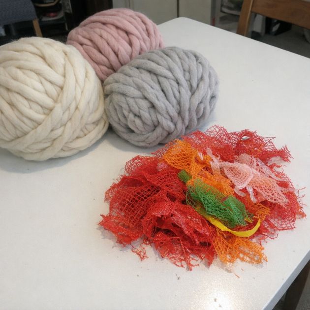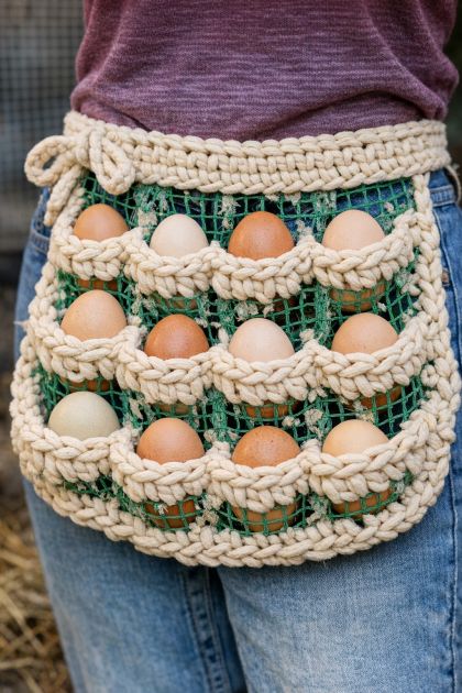 Crocheting with unusual materials can add a unique twist to your DIY projects. By combining chunky yarn with recycled mesh produce bags, you can create a sculptural egg-collecting apron. This innovative piece is perfect for springtime, offering a practical yet stylish way to gather eggs while giving a second life to mesh bags that would otherwise be discarded. It addresses both sustainability and the need for functional, aesthetic home and garden accessories.