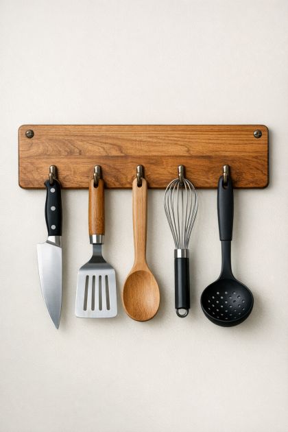 Mount this cutting board utensil rack on a kitchen wall with a neutral or complementary color to enhance its natural wood tones. The rustic charm of the wood combined with the sleekness of metal hooks creates a balanced aesthetic that suits both modern and traditional kitchens. It's best placed near your cooking area for convenience, and can be styled with matching wooden or metal kitchen accessories to create a cohesive look.