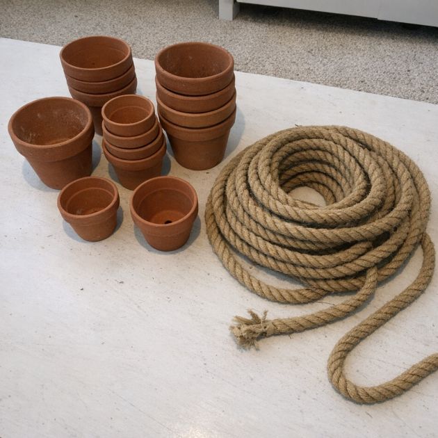 Cut a length of twine or nylon string approximately 6 feet long. This will be used to string the pots together.