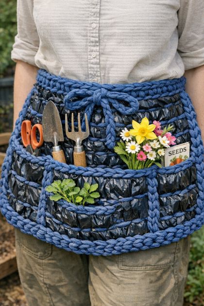 Crocheting is a beloved craft that allows for creativity and resourcefulness, especially when it involves upcycling materials. This DIY tutorial demonstrates a unique way to crochet a practical and stylish spring garden apron by interweaving thick denim blue yarn through a repurposed plastic trash bag. This innovative approach not only recycles plastic waste but also creates a sturdy, water-resistant apron perfect for gardening. The apron offers a solution to the common issue of soiling clothes while working in the garden, combining functionality with an eco-friendly design.