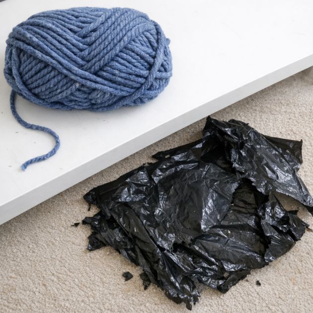 Ripped plastic trash bag, cleaned and cut into strips