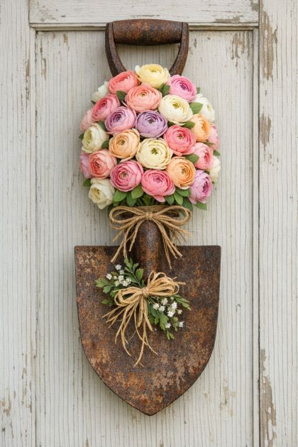 This DIY project transforms a rusty vintage garden spade into a charming and unique door swag, perfect for adding a touch of rustic elegance to your front door. Utilizing faux ranunculus blooms in pastel colors, this project breathes new life into an old tool, creating a welcoming and visually appealing entrance to your home. The blend of rustic and floral elements provides a distinctive aesthetic that is both inviting and stylish, making it an excellent conversation starter and a beautiful decorative piece.
