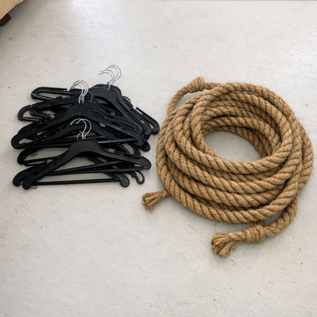 Lay out all 40 plastic coat hangers on a flat surface.