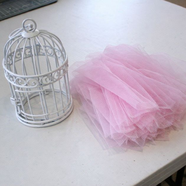 1. Cut the soft pink tulle ribbon into manageable lengths, approximately 1 to 2 yards each, to make it easier to wrap around the birdcage.