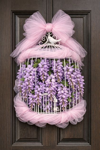 Transform your front door into a charming, eye-catching display with this DIY birdcage wreath. By wrapping a white wire birdcage in soft pink tulle and filling it with lavender faux wisteria, you create a whimsical yet elegant piece that welcomes guests with a touch of floral beauty. This project is perfect for those looking to add a personal touch to their home's exterior decor, offering a soft contrast to typical green wreaths while bringing a pop of color and texture to your entrance.