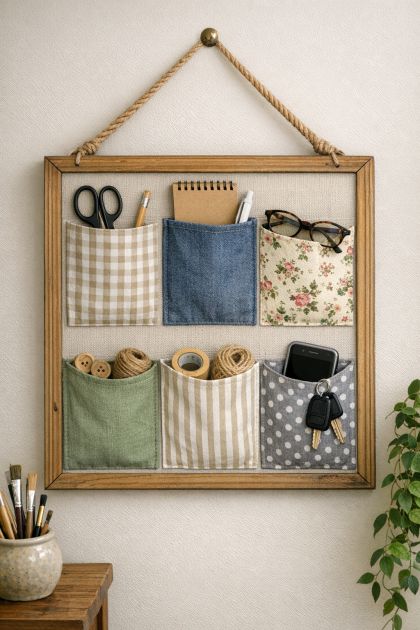 The finished wall organizer can be styled in a variety of settings. Hang it in a home office to hold stationery, in the kitchen for recipes and notes, or in a bedroom for accessories and small trinkets. Coordinate the fabric colors with the room's existing decor for a cohesive look. For a modern aesthetic, opt for monochromatic or geometric patterns. For a bohemian feel, mix and match vibrant colors and eclectic prints. The wooden frame adds a natural warmth that can be complemented with wooden furniture or accents in the room.