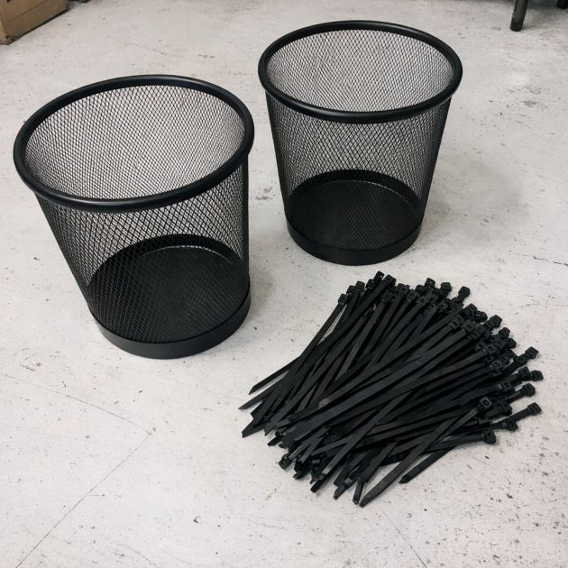1. Begin by aligning two wire wastebaskets, open ends facing each other, to form a sphere. Secure them at the joining rim using black zip ties, placing ties at equal intervals around the circumference.