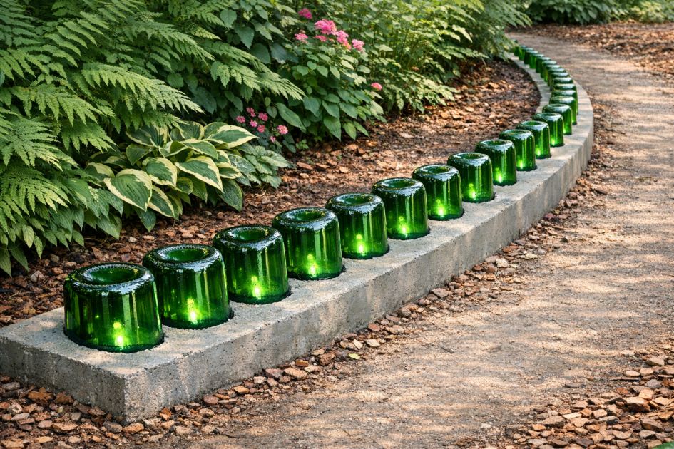 Transform your front yard into a captivating and unique space with a glowing vintage-style garden path border. By embedding green glass wine bottles into concrete, you create an enchanting walkway that captures the light beautifully, adding both charm and functionality. This project not only recycles used wine bottles but also provides a durable and visually striking garden feature that can withstand the elements.