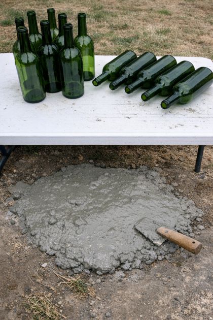 Take a cleaned green glass wine bottle and gently press it upside down into the concrete, leaving about a quarter of the bottle's height exposed.
