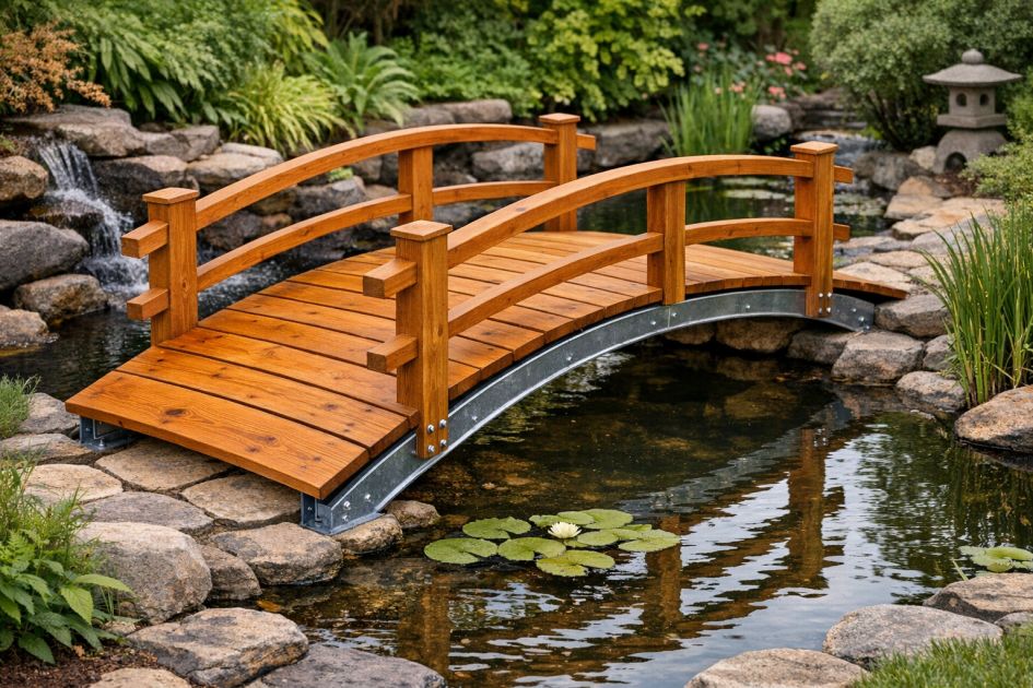 This DIY pond bridge suits a variety of outdoor styles, from rustic gardens to modern minimalist landscapes. The natural honey-stained cedar harmonizes with earthy tones and greenery, making it an excellent fit for naturalistic and Japanese-inspired gardens. Its sleek, arched design also complements contemporary settings, adding a touch of elegance and structure. Pair with surrounding stone pathways, lush plants, and water features for a cohesive backyard design.