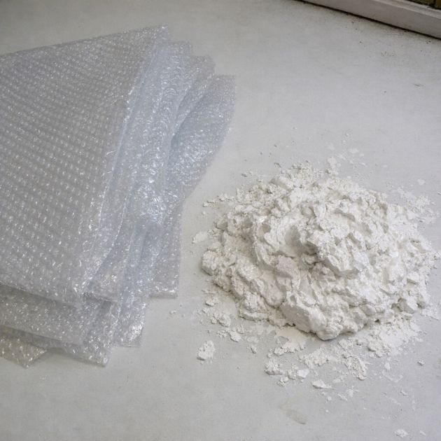 Carefully peel the plaster-coated sheets off the bubble wrap, revealing the textured honeycomb pattern on the plaster surface.