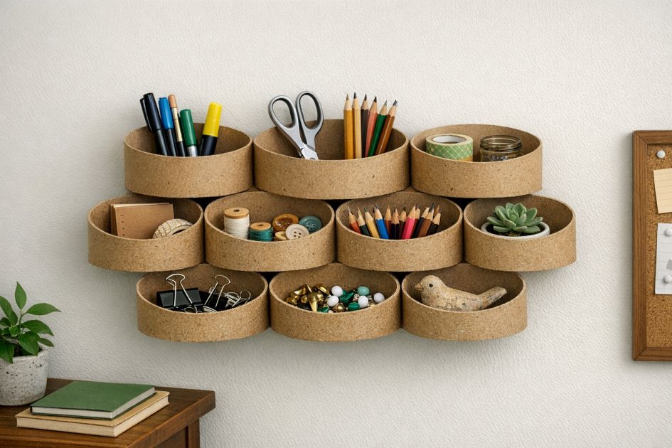 Once completed, this cardboard tube wall organizer can be styled in a home office, study area, or even a craft room. Consider placing it against a brightly painted wall to make the natural color of the cardboard pop. You could also paint the tubes in a color scheme that complements your room's decor for a more cohesive look. Adding small potted plants or decorative items inside the tubes can enhance its aesthetic appeal, turning a simple organizer into a striking wall feature.