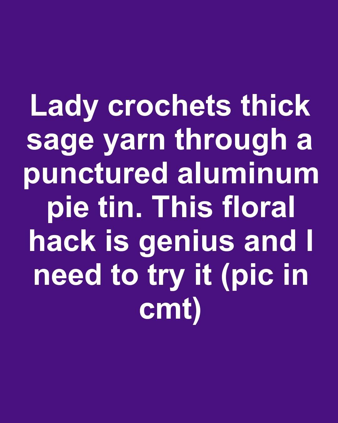 Lady crochets thick sage yarn through a punctured aluminum pie tin. This floral hack is genius and I need to try it