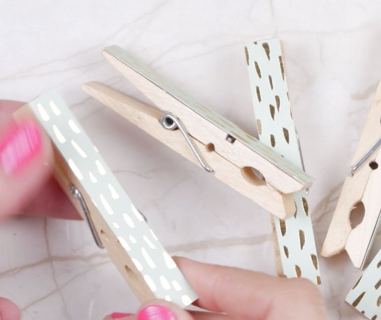 3. Repeat steps 1 and 2, using the other type of decorative paper on the other half of the clothespins.