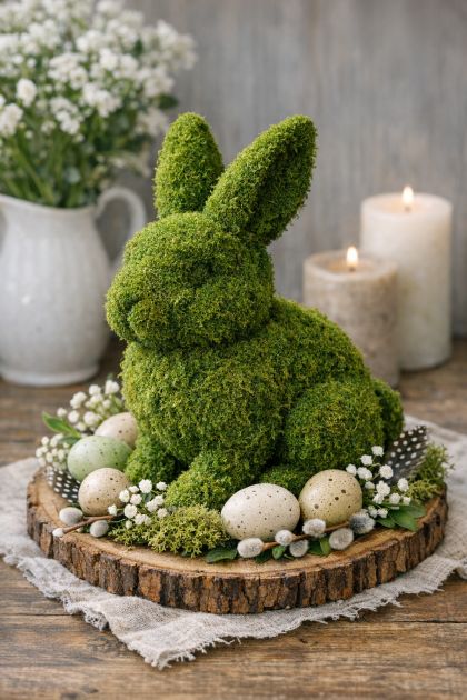 This DIY moss bunny centerpiece fits beautifully in a variety of interior styles, from modern minimalist to rustic farmhouse. Place it on a dining room table, surrounded by natural wooden chargers and simple white dinnerware for a cohesive look. For a more eclectic setting, pair it with colorful ceramics and vintage glassware. Adding candles or a linen table runner can enhance the ambiance, creating a cozy and inviting dining experience.