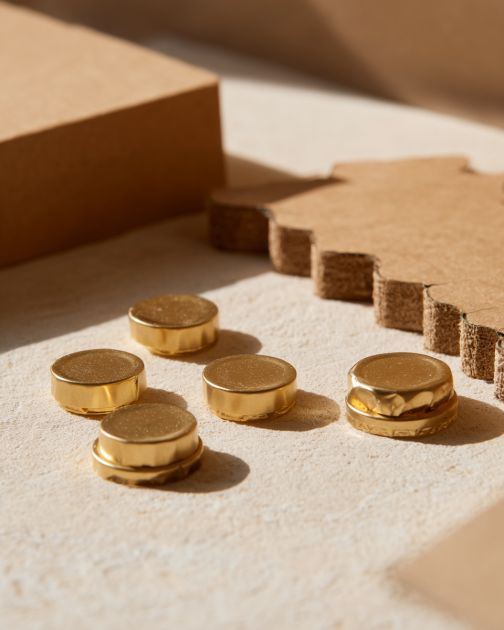 Arrange the faux gold bottle caps on the cardboard cutout to determine your pattern. Ensure the caps are evenly spaced and cover the surface completely.