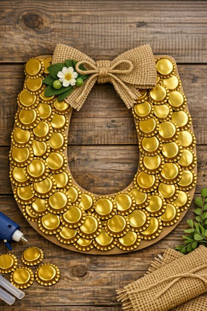 Creating a lucky horseshoe wreath using shiny faux gold bottle caps is a unique and eye-catching way to adorn your front door. This DIY project combines the allure of shiny gold with the charm of a horseshoe, symbolizing luck and prosperity. It's an engaging craft for those who love to add a personal touch to their home decor, and it can be a great conversation starter for guests.