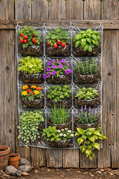 DIY Vertical Planter from Hanging Clear Plastic Pockets