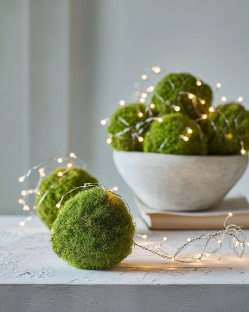 Take one set of warm white string lights and begin wrapping them around the first moss ball. Start at the base and work your way up, evenly spacing the lights as you go.
