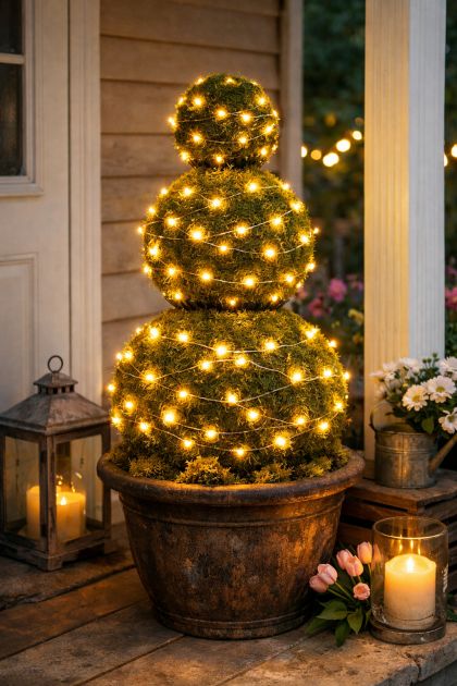 Position the glowing topiaries on your front porch, arranging them symmetrically or in a staggered display for visual interest.