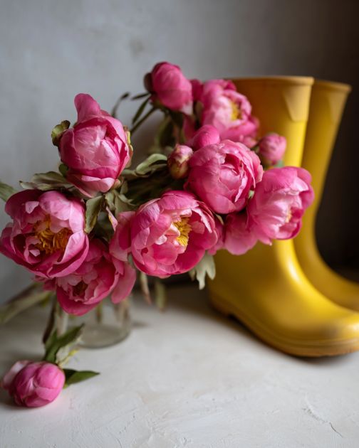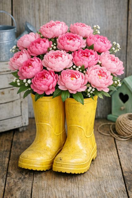 Position the rainboot vases on your porch or in the desired location. Adjust the peony stems as needed to achieve the perfect arrangement.