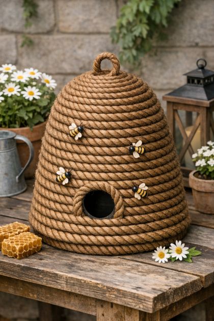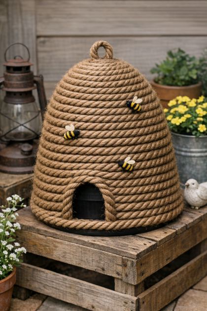 This DIY rustic beehive decor can be styled with other natural elements such as potted plants, wooden furniture, or metal accents to create a cohesive outdoor space. Pair it with fairy lights or lanterns for a warm, inviting ambiance. It works well in gardens, on patios, or even as an indoor accent piece in a farmhouse-themed room.