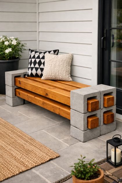 This DIY modern porch bench works beautifully in contemporary outdoor settings. Consider pairing it with outdoor cushions in neutral or earth tones to enhance comfort and style. Surround the bench with potted plants or place it near a garden feature to create a cohesive and inviting outdoor retreat. The contrast between the wood's natural warmth and the industrial look of the cinder blocks adds a unique aesthetic, perfect for modern gardens or patios.