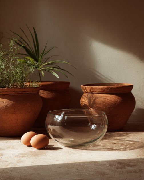 This birdbath complements a rustic or cottage-style garden. Pair it with lush greenery or colorful flower beds to create a focal point. The earthy tones of the terracotta contrast beautifully with the transparent glass bowl, making it an eye-catching piece. Place it near a garden path or among a cluster of potted plants to integrate it seamlessly into your outdoor space.
