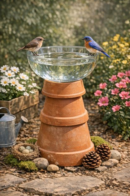 Creating a DIY rustic spring birdbath is a delightful way to add charm and utility to your garden. This simple project, which involves stacking a large clear glass salad bowl onto three thick upside-down terracotta pots, is not only budget-friendly but also visually appealing. The concept has gained immense popularity online due to its unique blend of rustic aesthetics and functionality, providing a refreshing spot for birds while enhancing your backyard decor.