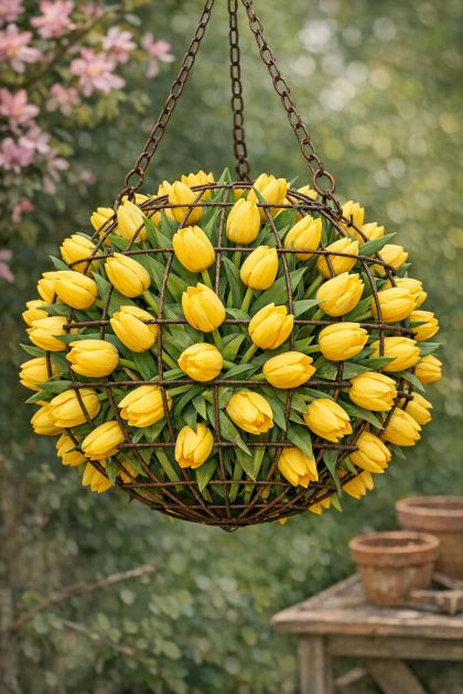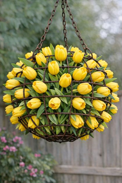 Transform your front yard into a conversation starter with this stunning DIY floral orb made from weaving inexpensive yellow tulips through a rustic wire hanging planter basket. This creative project not only breathes new life into old garden materials but also adds a cheerful pop of color to your outdoor space. With just a few affordable items, you can craft a striking piece that will have your neighbors stopping in their tracks.