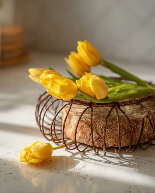 Cut the stems of the yellow tulips to a length that will allow them to weave through the wire basket, using the wire cutters.