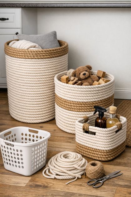 For variations, consider using different colors of cotton rope to match your decor. You could also experiment with patterns by alternating colors or creating stripes. If you prefer a more polished look, consider adding decorative handles made from leather strips or wooden beads. To create a set of baskets, use different sizes of bins and rope colors for a coordinated yet diverse look.