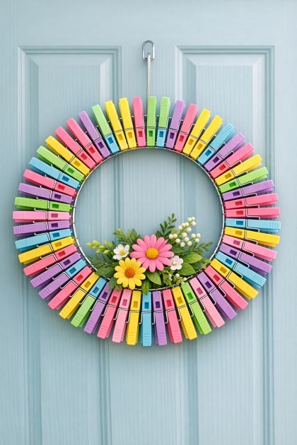 This DIY wreath can be styled to complement a variety of home aesthetics. Pair it with pastel-colored planters or a matching doormat to create a cohesive look. The playful colors of the clothespins can brighten a neutral porch or add a whimsical touch to a more traditional setting. Consider surrounding the wreath with potted flowers that echo the pastel hues for a harmonious springtime display.
