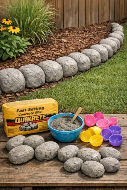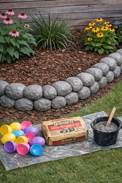 Transform your backyard with a unique and durable faux stone border using an unexpected method: filling large hollow plastic Easter eggs with quick-dry gray concrete. This creative DIY project not only adds a charming aesthetic to your garden but also serves as a conversation starter with neighbors intrigued by your backyard's new look. This project is perfect for those looking to add a touch of whimsy and elegance to their outdoor space without the high cost of traditional stone edging.