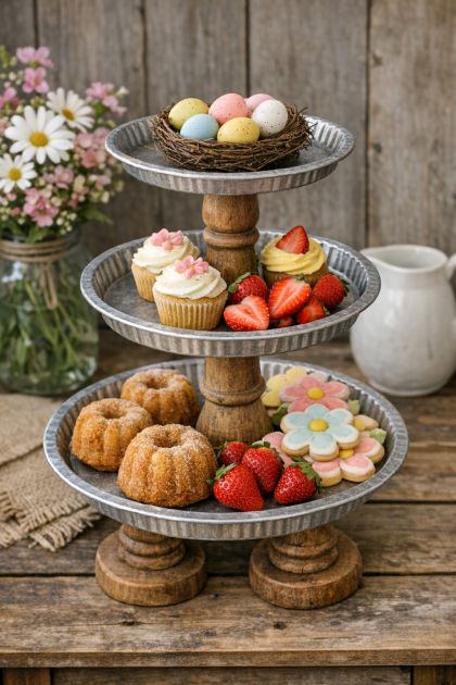This DIY rustic spring dessert tier can be styled beautifully in any kitchen, particularly those with a farmhouse or rustic aesthetic. Pair it with wooden kitchen counters or a vintage tablecloth for a cohesive look. You can also place it against a white subway tile backsplash or on an open shelf to accentuate its rustic charm. Consider surrounding it with small potted plants or fresh herbs to enhance the spring theme.